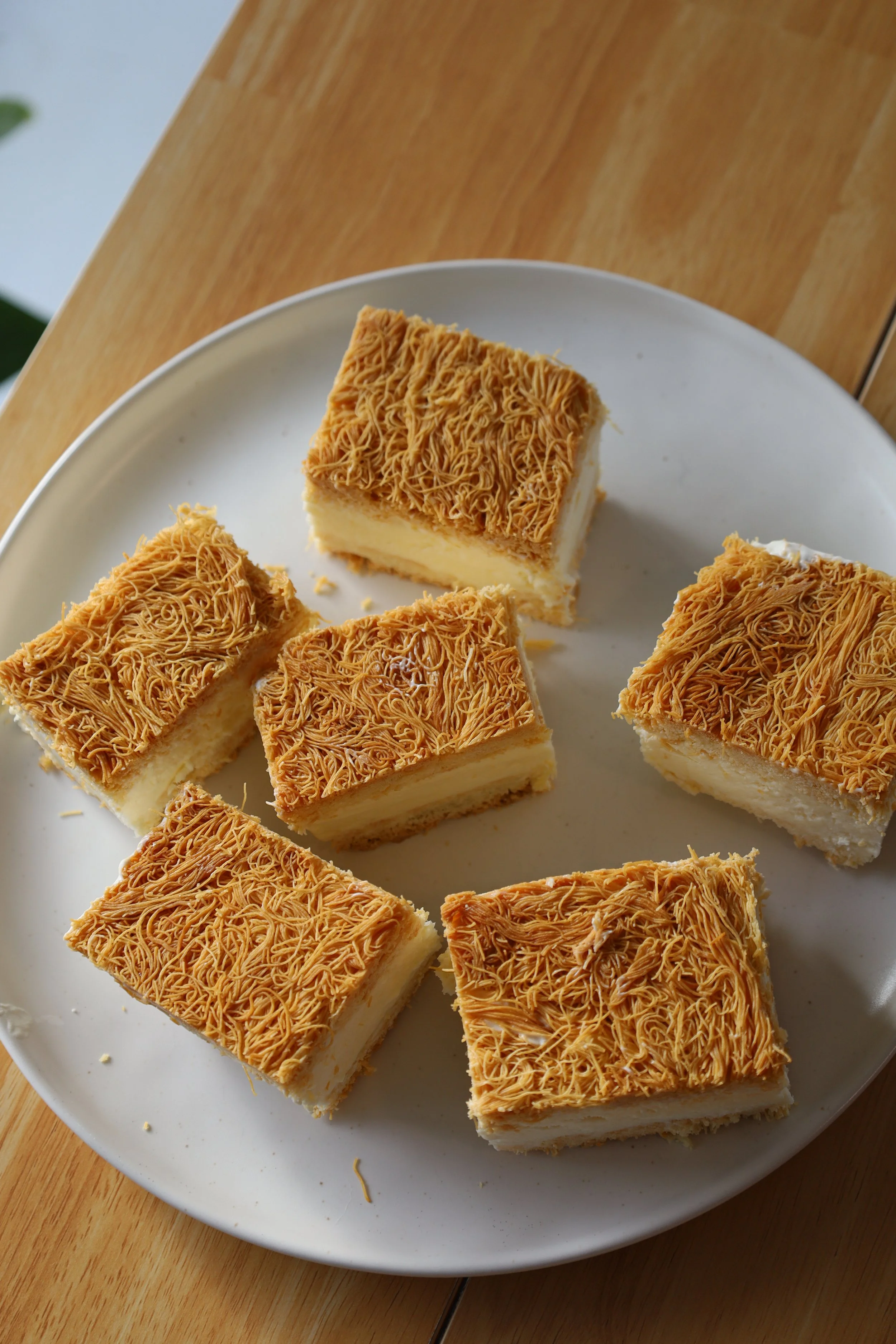 - Add the kataifi layer to a wire-lined baking sheet and allow to cool.
